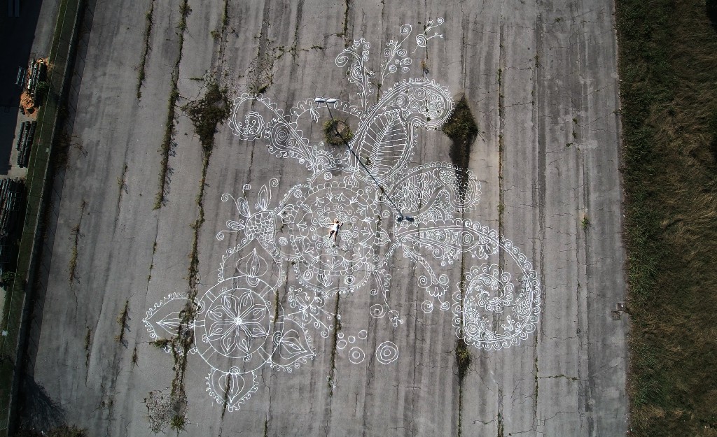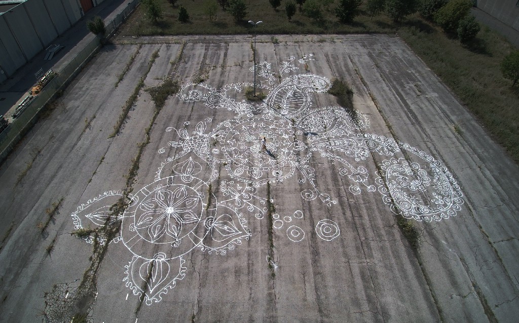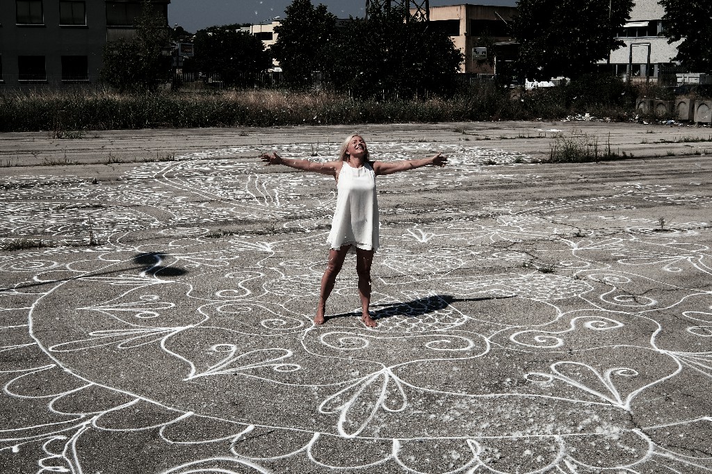 Vicenza, 2017 videoart, performance.  The artist Rita Pierangelo has always been active and sensitive to the issue of violence against women, she will perform a performance against femicide. Starting from a silhouette of a body a mandala will follow which in Buddhism is a form of prayer, A MANTRA Designed with SALT, it will quickly melt and predict a rebirth, hope.